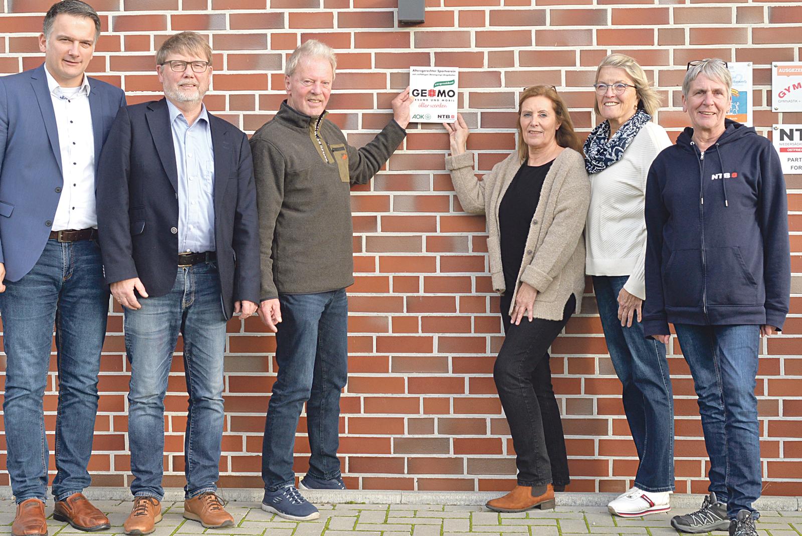 Gemeinsam freuen sie sich über das Gütesiegel des NTB für den TV Bunde: Gemeindebürgermeister Uwe Sap, 1. Vorsitzender des TV Bunde Wilhelm Timmer, TV-Geschäftsführer Reinhard Borchers, TV-Turnabteilungsleiterin Birgitt Hejnal-Modder, TV-Bewegungsbegleiterin Wilma Nee-Winterboer und Uschi Selchow vom NTB-Landesturnschule in Melle.  © Foto: Born