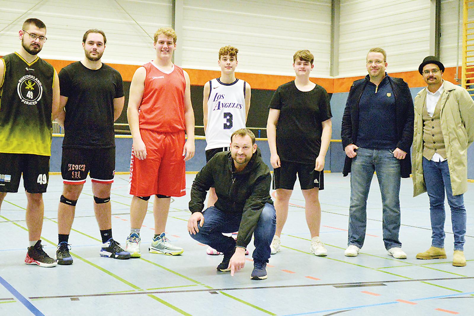 David Wagner (hockend) zeigt es an: Die Basketballer dürfen wegen alter Linien in der Bunder Mölenlandhalle keine Punktspiele austragen.  © Foto: Born