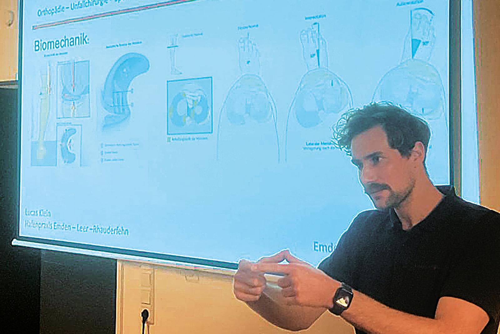 Dr. Lukas Klein hielt in Timmel vor zahlreichen Fußball-Trainern einen Vortrag über Sportverletzungen.  © Foto: Borgmann