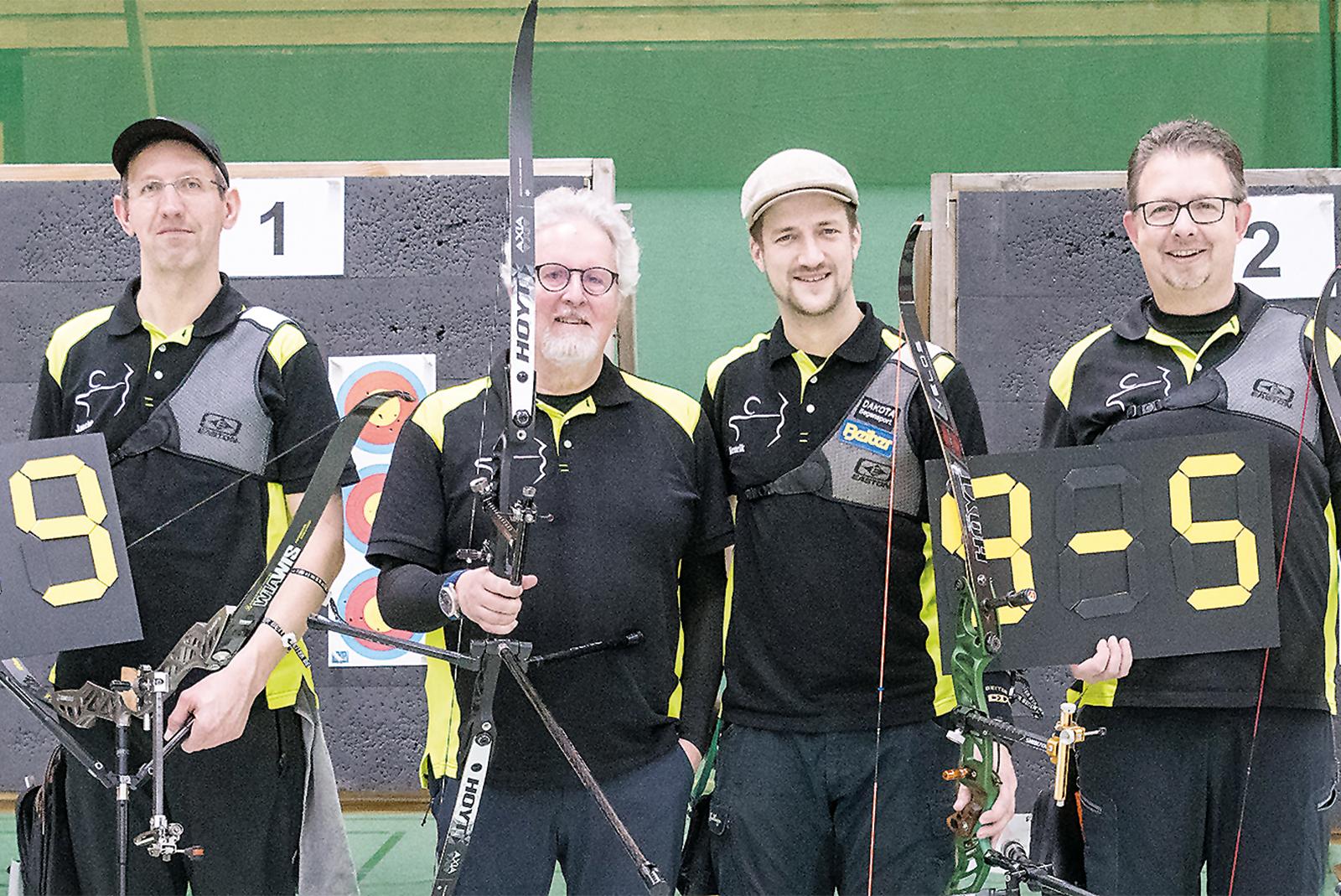 Jascha Nieland (von links), Peter Gerdes, Henrik Elsasser und Frank Otten zeigen die Tafeln mit dem Punkte-Endstand (9:5) und das beste Satzergebnis (59 von 60). © Foto: privat