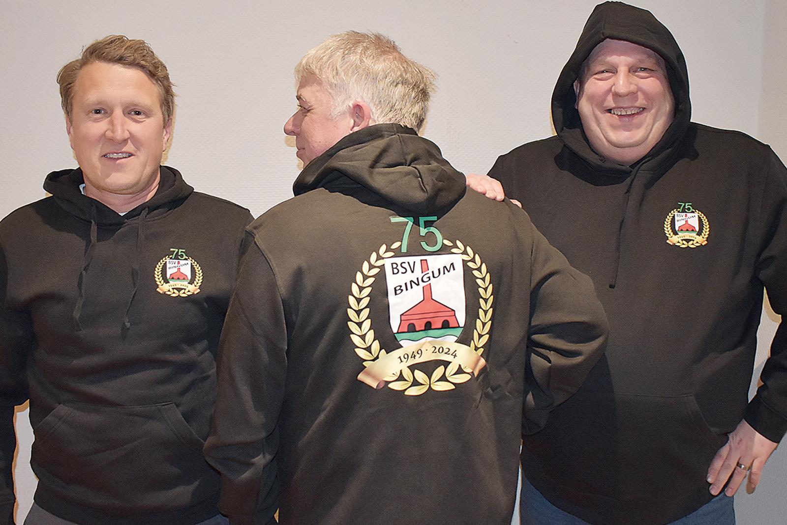 Jann Ubbens (von links), Carsten Kempen und Tobias Borsum präsentieren die Kapuzenpullover zum 75-Jährigen des BSV. © Foto: privat