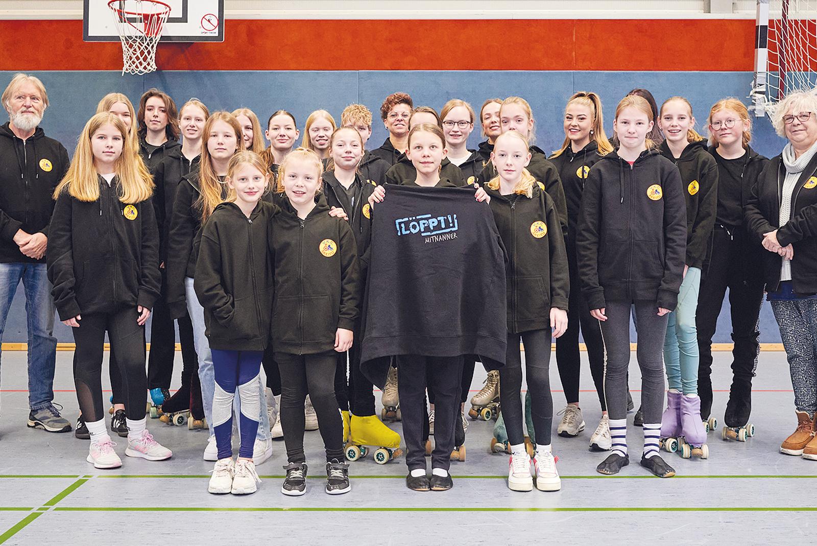 Während des Trainings überraschte Lena Busboom von der Stabstelle Ehrenamt und Freiwilligenagentur des Landkreises Leer die gemeinsame Show-Gruppe »AkEiTu« des TV Bunde und des Winschoter Rollschuhclubs. Die gesamte Gruppe wurde mit neuen Hoodies mit dem Logo des Projektes »Lö...