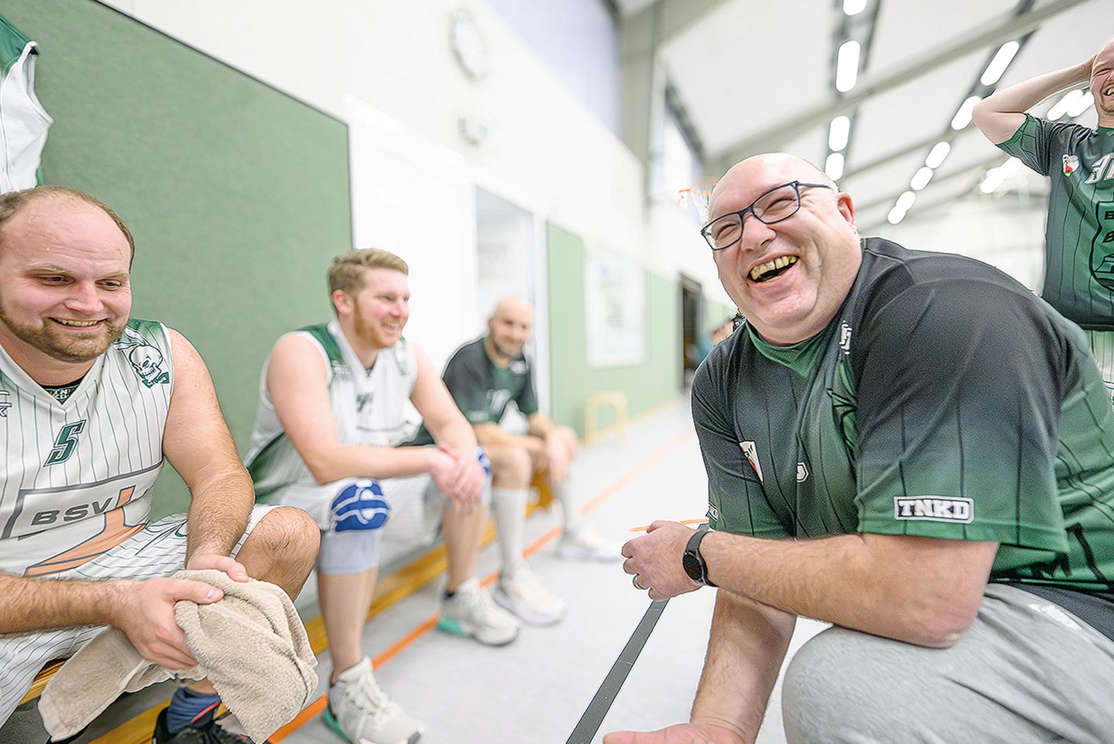 Gute Laune beim BSV-Coach: Michael Veenhuis (kniend rechts) feierte am Sonntag seinen 50. Geburtstag mit einem 72:62-Sieg gegen den TV Delmenhorst II im Gepäck. Marco Janßen (links) hatte mit 30 Punkten großen Anteil daran. © Foto: Bruins