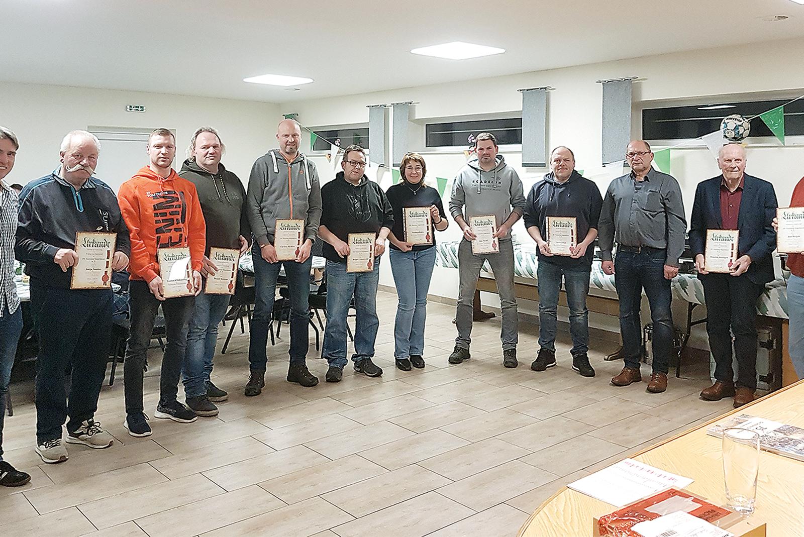 Herbert Waltemathe (1. Vorsitzender, Dritter von rechts) und Micha Gerke (2. Vorsitzender, von links) ehrten Antjo Smeins, Thomas Klinkenborg, Dennis Siemons, Carsten Harders, Holger Groenewold, Svetlana Korte, Jens Tirrel, Thomas Poel, Heinrich Sinningen und Jan Heijen. © Foto: Siemons