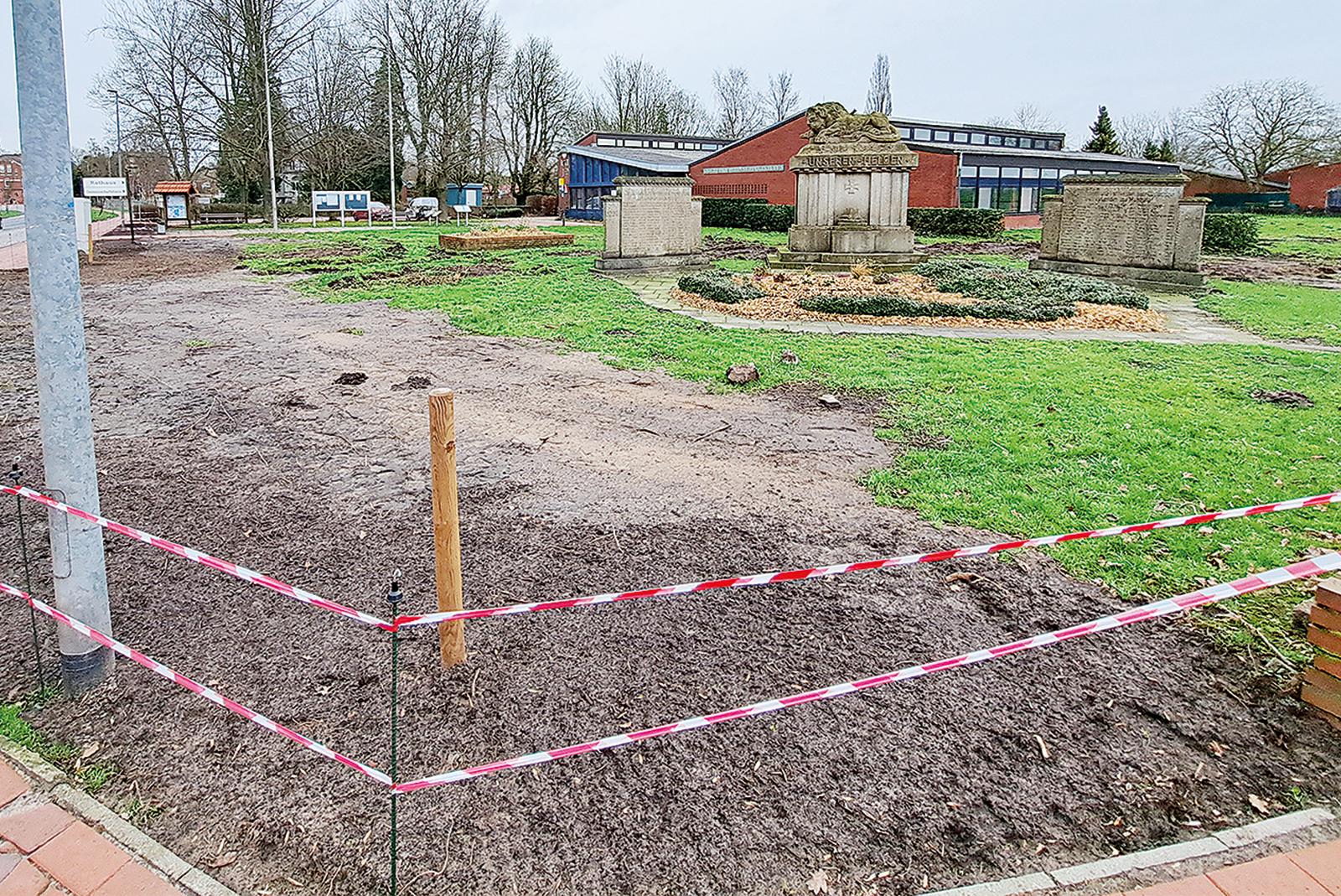 Neugestaltung am Jemgumer Ortseingang: Auf dem Grundstück des Dörfergemeinschaftshauses (DGH) hat das Team des Bauhofs der Gemeinde dieser Tage die alte Hecke und die Birken entfernt, um eine neue Buchenhecke anzupflanzen und dabei auch das Ehrenmal ...