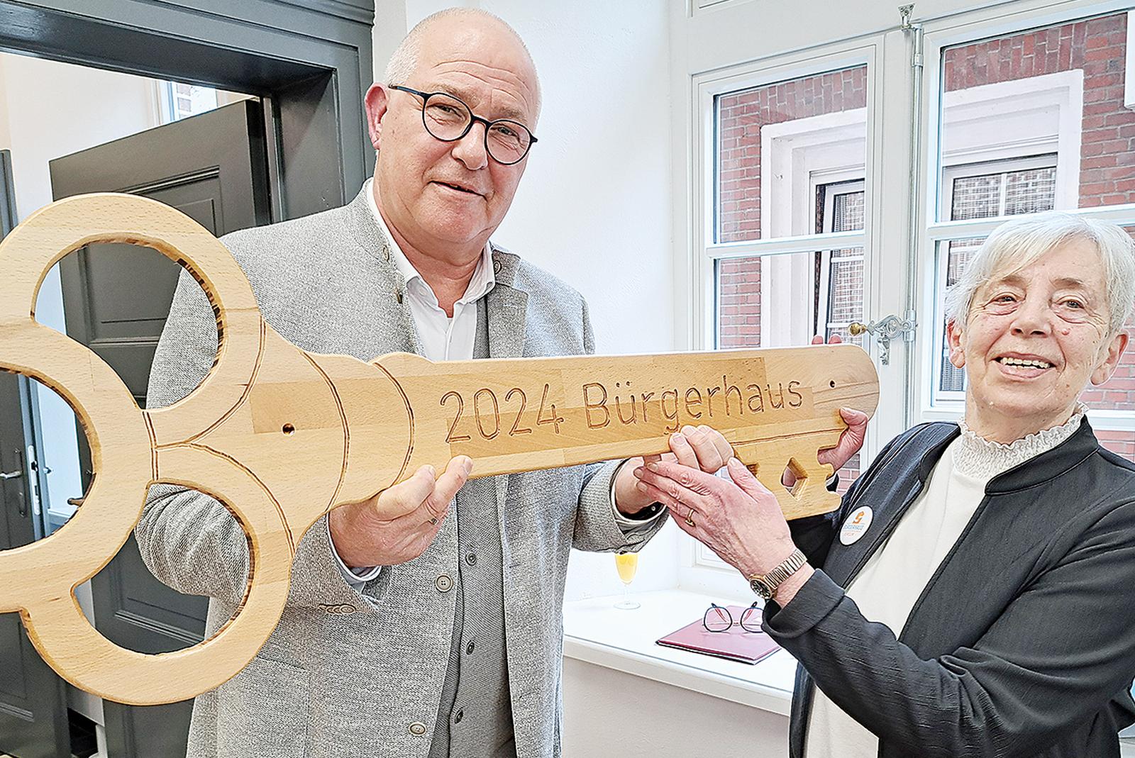 Ein großer Schlüssel für ein großes Gebäude: Mit einer symbolischen Schlüsselübergabe von Bürgermeister Hans-Peter Heikens an die Trägervereinsvorsitzende Henriette Remmers wurde am ...
