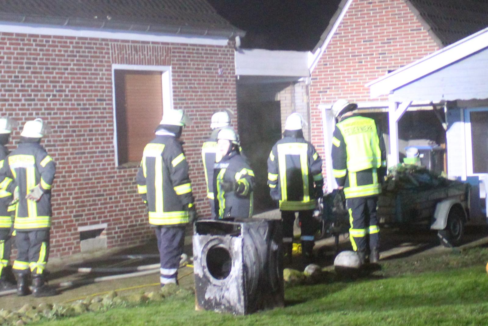 Die Bewohner eines Wohnhauses hatten Brandgeruch wahrgenommen und dann festgestellt, dass ein Schuppen direkt an einer Garage in Brand geraten war. Sie versuchten noch, mit einem Feuerlöscher den Brand zu löschen. Als das keine Wirkung zeigte und die Rauchentwicklung zu stark wurde, setzten sie den Notruf ab und begaben sich in Sicherheit.