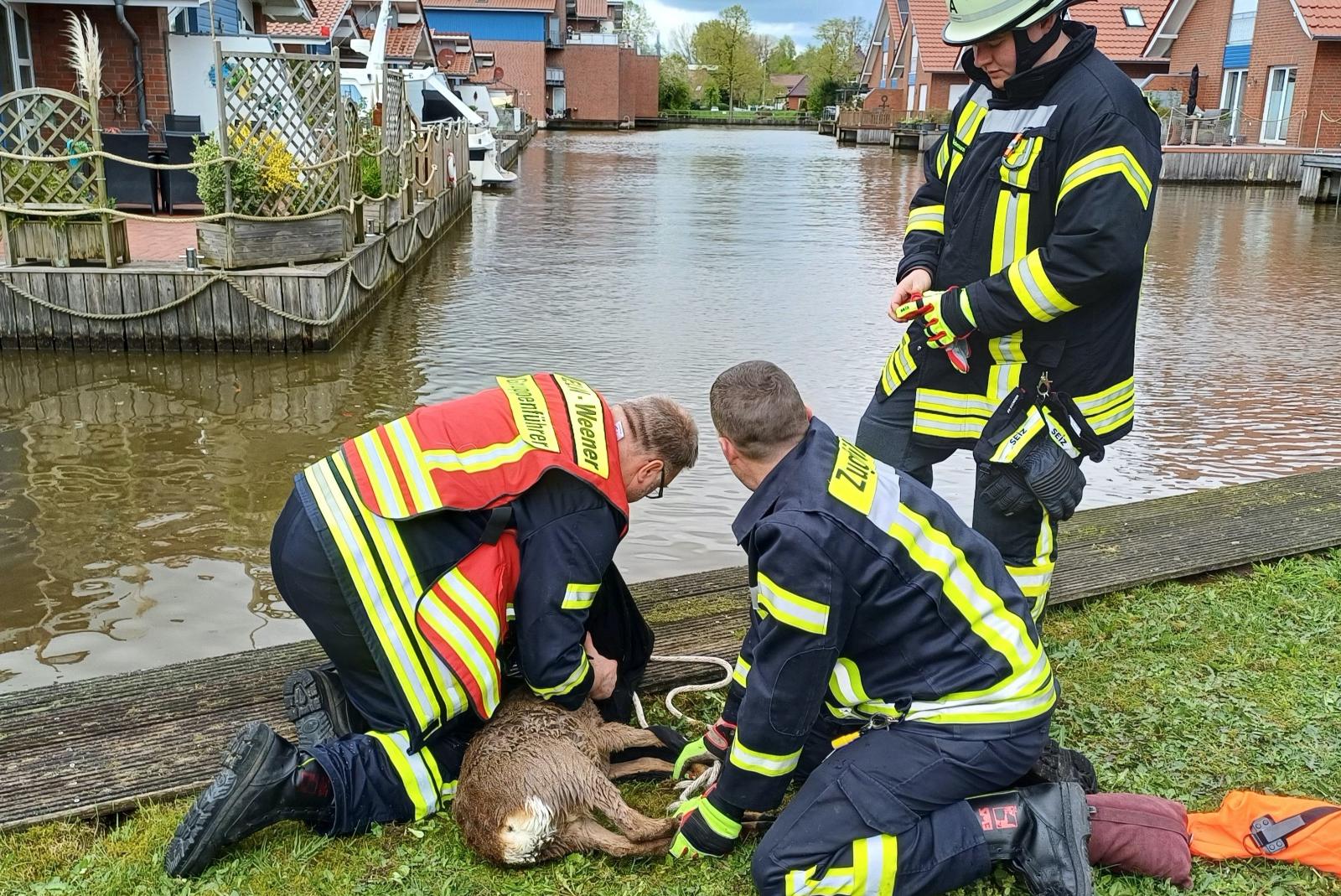 Am Sportboothafen in Weener war ein Reh in den Hafenbecken gestürzt und konnte wegen der hohen Spundwände nicht herausklettern. Anwohner hatten das Reh im Wasser gesehen und weil sich das Tier nicht eigenständig aus der misslichen Lage befreien konnte, alarmierten sie die Feuerwehr.