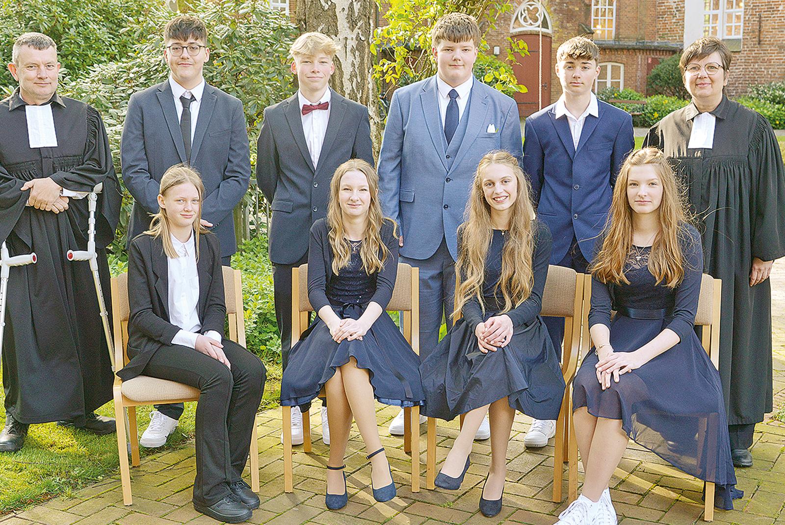 Zur festlichen Musik des Bläserchors, begleitet von den Pastoren Adolf Schwirzer und Inka Dohrmann-Westerdijk, zogen jetzt acht Jugendliche der Weeneraner Georgskirchen-Gemeinde zu ihrem Konfirmationsgottesdienst in ihre Kirche ein. Das Bild zeigt (stehend von links) Pastor Adolf Schwirzer, Enrico Kehlmann, ...