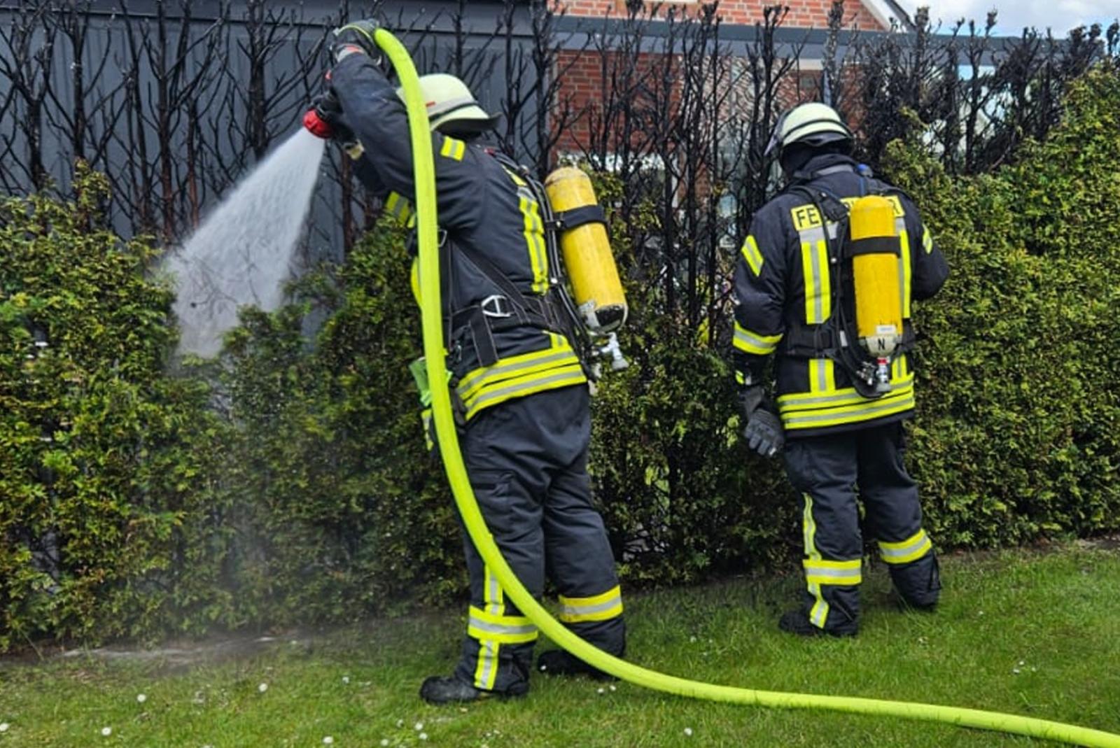 Anwohner konnte die Hecke noch vor Eintreffen der Feuerwehr mit einem Gartenschlauch weitestgehend selber löschen.