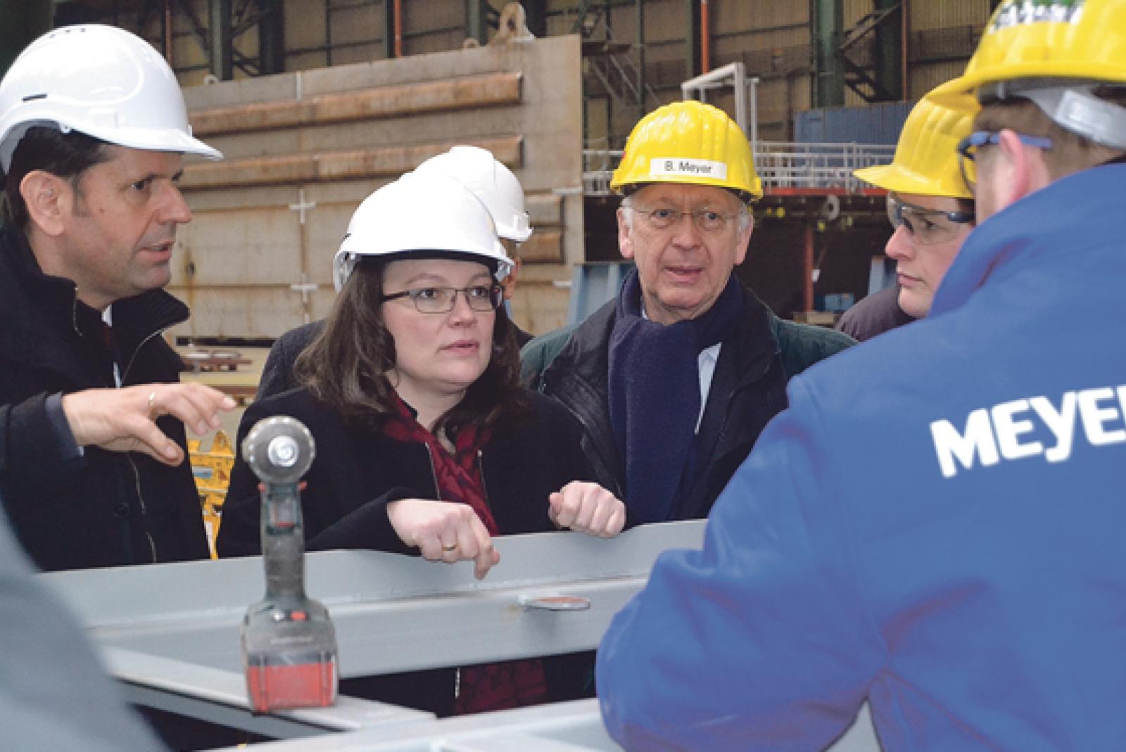 Bundesarbeitsministerin Andrea Nahles (SPD) hat die Papenburger Meyer Werft als »Vorbild für ganz Deutschland« gelobt. Die sozialen Standards des Familienunternehmens seien beispielgebend für andere Firmen, so Nahles gestern bei ihrem Werft-Besuch.
