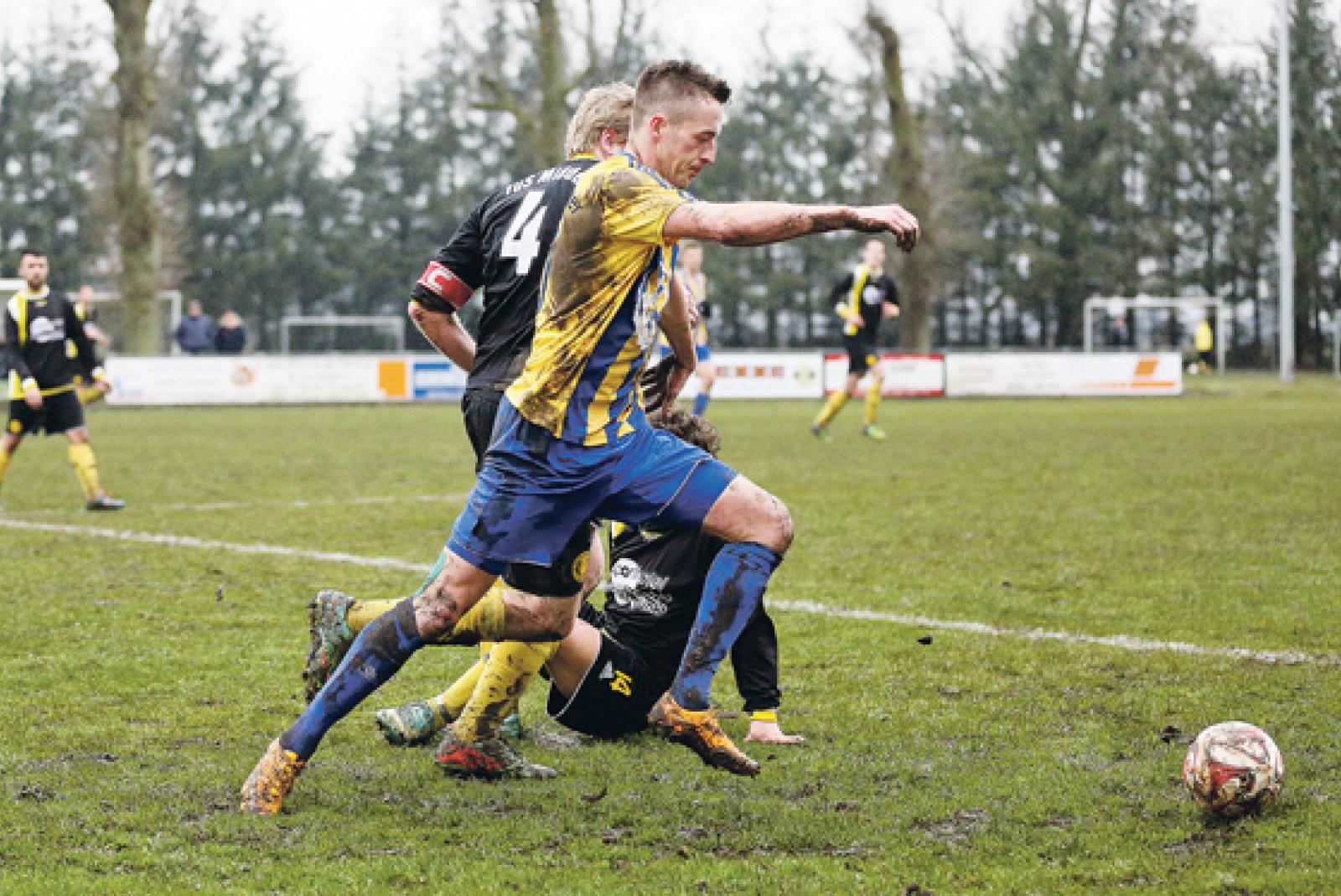 Zur Schlammschlacht wurde das Kampfspiel zwischen dem TuS Weener und dem TuS Middels. Hier duellieren sich Martin Meyer und Christian Janssen um den Ball. © Foto: Schulte
