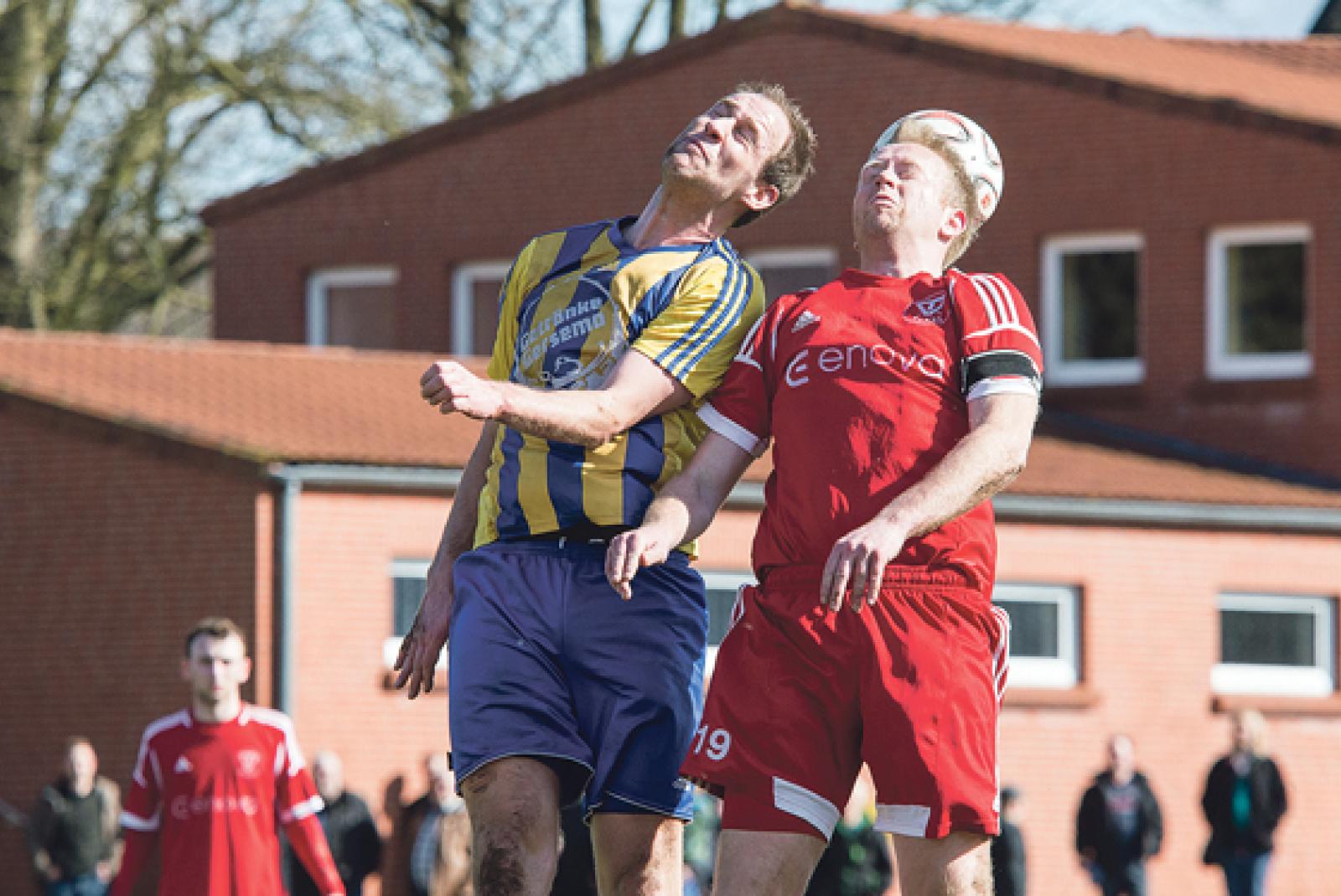 Augen zu und durch: Das Derby war nichts für Fußball-Feinschmecker. Hier liefern sich Dennis Boelen (l.) und Thomas Girod ein Kopfballduell. © Fotos: Mentrup
