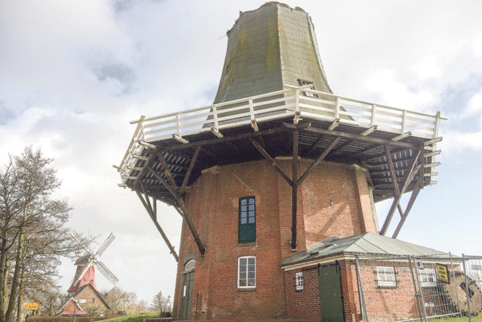 Niederländische Spezialisten wollen der grünen Zwillingsmühle im Fischerdorf Greetsiel bis Ende April eine neue Kappe aufsetzen.