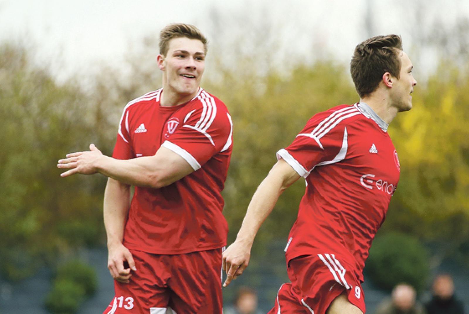 Im Jubel vereint: Eike (l.) und Keno Schmidt waren die prägenden Figuren beim Bunder Sieg über Großefehn. © Foto: Schulte