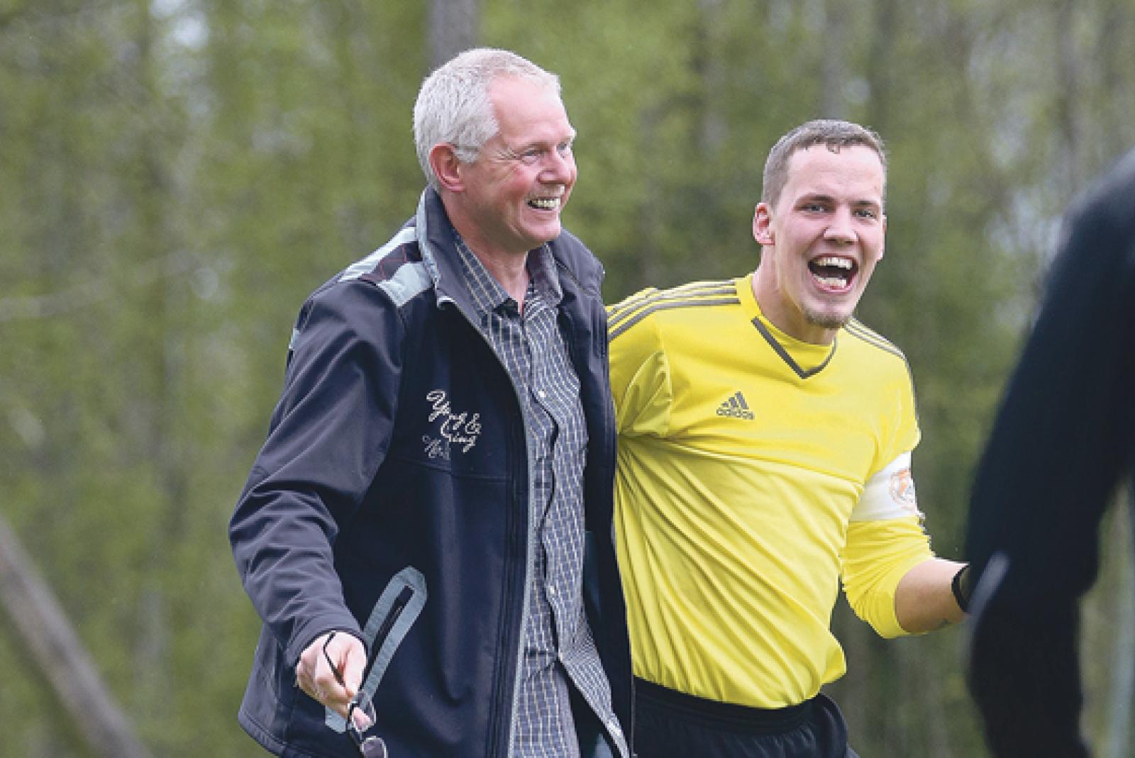 Strahlende Wymeerster: Trainer Frank Dreesmann und Torhüter Ingo Lüppens bejubeln den Derbysieg. © Foto: Schulte