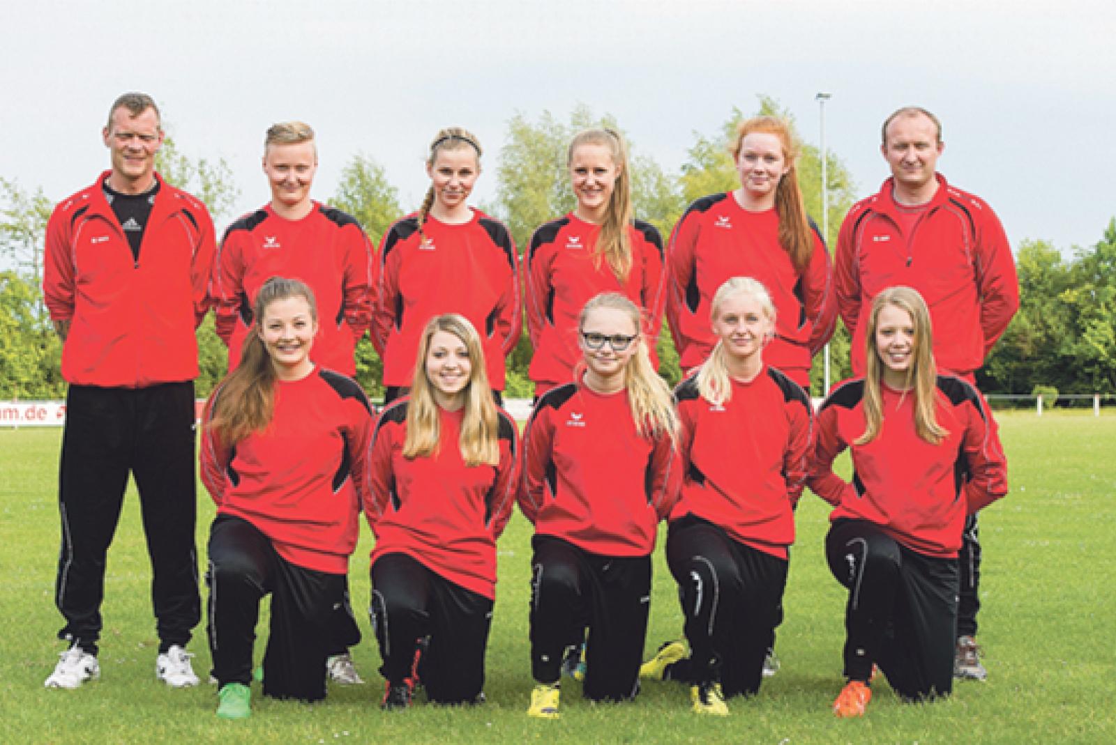 Die B-Juniorinnen des SV Ems Jemgum haben sich enorm entwickelt und wollen nun für weitere Überraschungen sorgen. Zum Team gehören (obere Reihe von links) Tim Schulte, Lena Woortmann, Milena Vohs, Pia Geertsema, Liz Temmen, Nils Hofmann, (untere Reihe von links) Svenja Backer, Pia Brauer, Rieke Nagel, Lotte Bergmans und Celine Schulte. © Foto: Mentrup