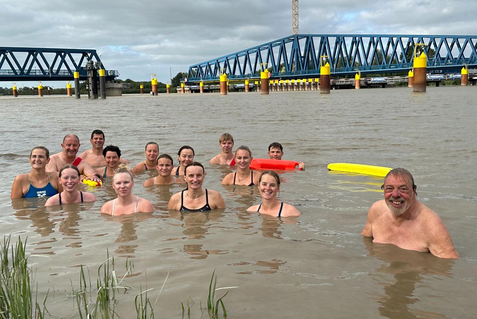 15 Rettungsschwimmerinnen und Rettungsschwimmer der DLRG Weener im Alter von 15 bis 76 Jahren absolvierten jetzt eine Trainingseinheit in der Ems. Bei einer Wassertemperatur von 22 Grad Celsius stürzten sich an der Schleuse zehn Frauen und fünf Männer in die trü...