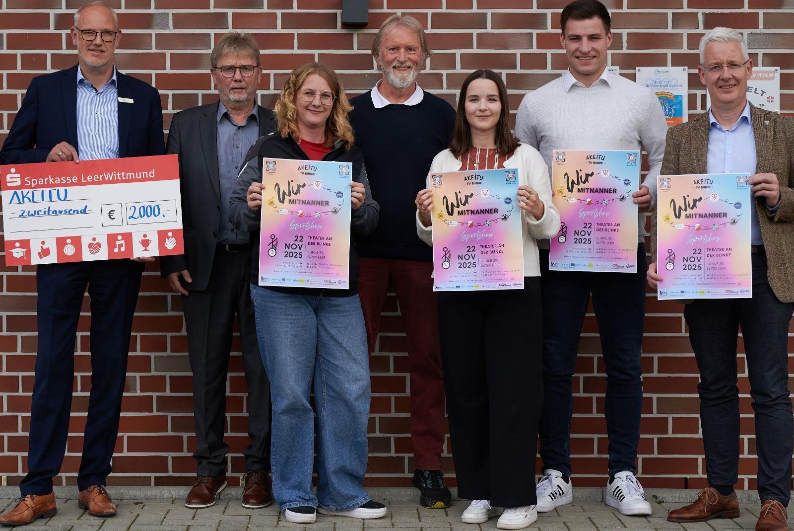 Ralf Theile (von links, Sparkasse Leer-Wittmund), Wilhelm Timmer (1.Vorsitzender TV Bunde), Carina Severiens (Abteilungsleiterin Turnabteilung, Organisator und Trainerin AKEITU), Rolf Boehnke (Organisator und Trainer AKEITU), Imke Barth (Ems-Dollart-Region), Christoph Buse (Ostfriesische Brandkasse Bunde) und Schirmherr Landrat Matthias Groote präsentieren die Sportshow. © privat