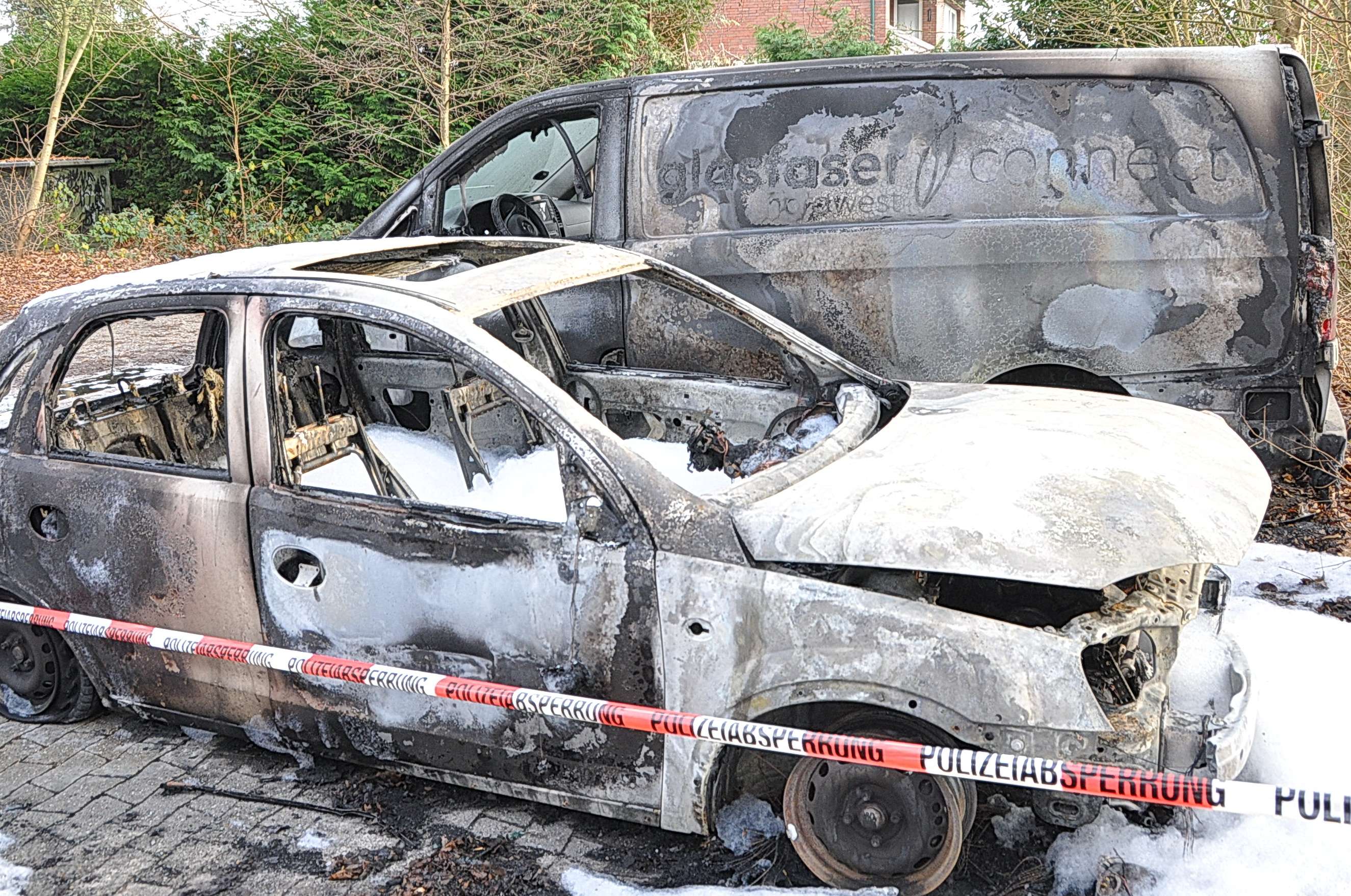 Die Serie von Kfz-Bränden im Leeraner Stadtteil Loga hat sich in der Nacht zum heutigen Donnerstag fortgesetzt. Diesmal standen ein Mercedes-Transporter und ein Kleinwagen, ein Opel Corsa, lichterloh in Flammen. Die Zahl der mutmaßlich durch Brandstiftung zerstörten Fahrzeuge erhöhte sich damit auf zwölf.
