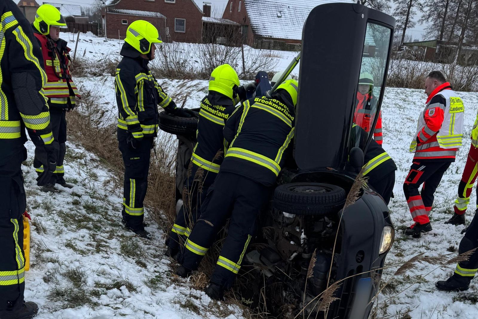 in Kleinwagen ist gestern in Leezdorf von einer vereisten Straße abgekommen und in einen Graben gerutscht. Der Renault Twingo blieb dabei auf der Seite liegen, deshalb konnte der Fahrer das Fahrzeug nicht verlassen. Gegen 11 Uhr wurde die Freiwillige Feuerwehr alarmiert. Die Einsatzkräfte konnten die Beifahrertür des Wagens mit wenigen Handgriffen öffnen und den Fahrer aus dem Fahrzeug befreien. Nicht einfach war dabei die Anfahrt auf der vereisten Straße für die schweren Einsatzfahrzeuge. Neben der Feuerwehr waren auch die Polizei und der Rettungsdienst vor Ort im Einsatz.