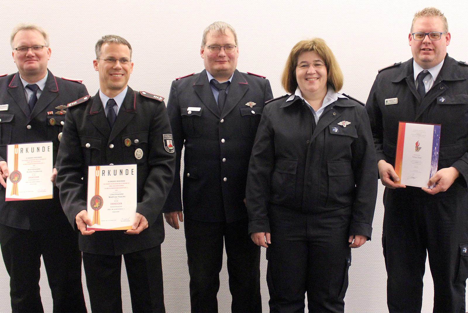 Andre Feldkamp (Folmhusen) und Matthias Haacke (Bingum, von links) wurden ebenso geehrt wie Timo Smit (rechts). Gewählt wurden Claas Schmidt und Nicole Sackl.  © Foto: Rand (Feuerwehr)