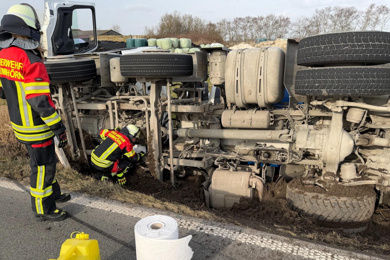 Nach Abschluss dieser Arbeiten wurde die Einsatzstelle von der Feuerwehr an die Polizei übergeben. Die Bergung des verunglückten Betonmischers aus dem Graben wird ein Bergungsunternehmen übernehmen.