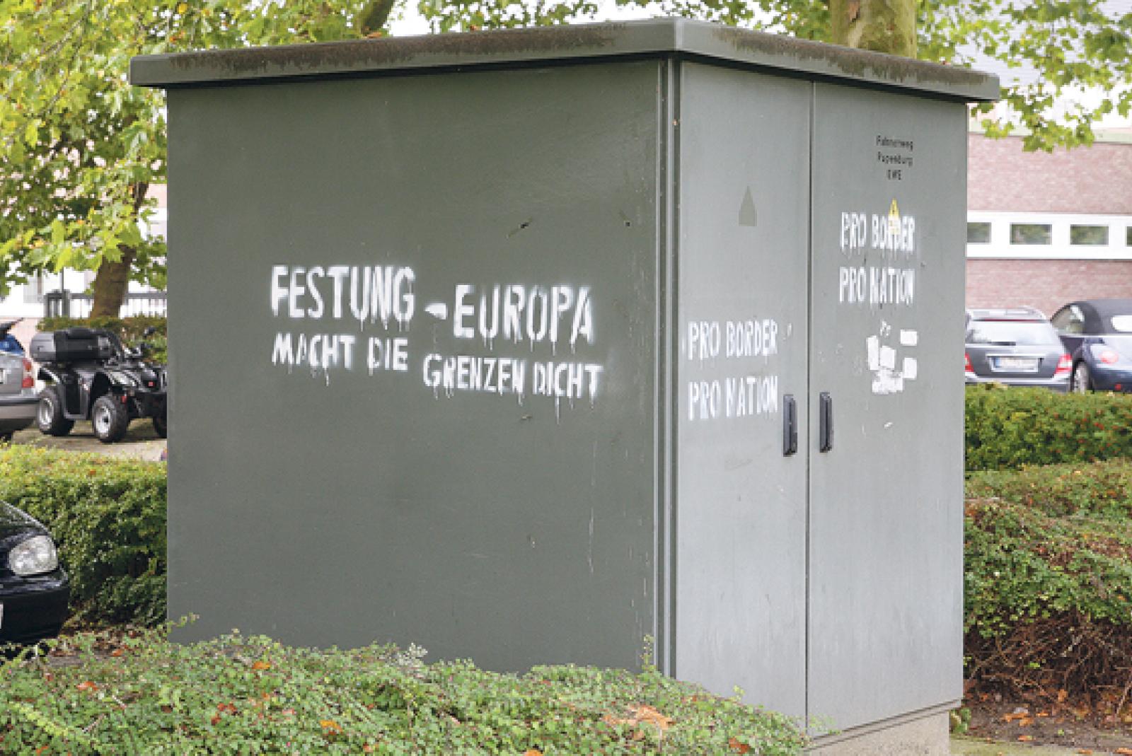 An den Berufsbildenden Schulen (BBS) am Fahnenweg und an der Kleistschule in Papenburg wurden Parolen wie »Festung Europa – Macht die Grenzen dicht« und »Pro Border – Pro Nation« an die Trafostationen der EWE und auch an das Gebäude der Kleistschule ...